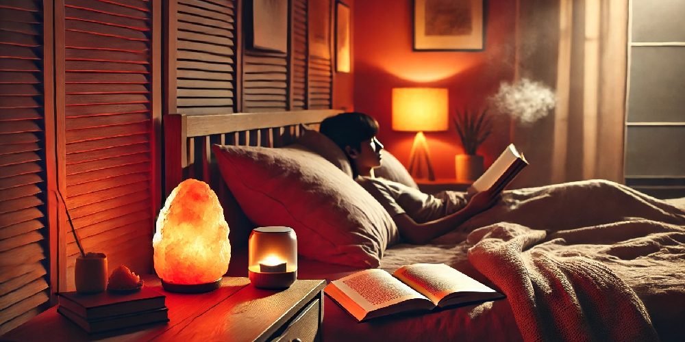 Tu peux utiliser une lampe rouge ou une veilleuse relaxante, que tu allumes une heure avant de dormir, à la place de ta lampe de chevet classique.